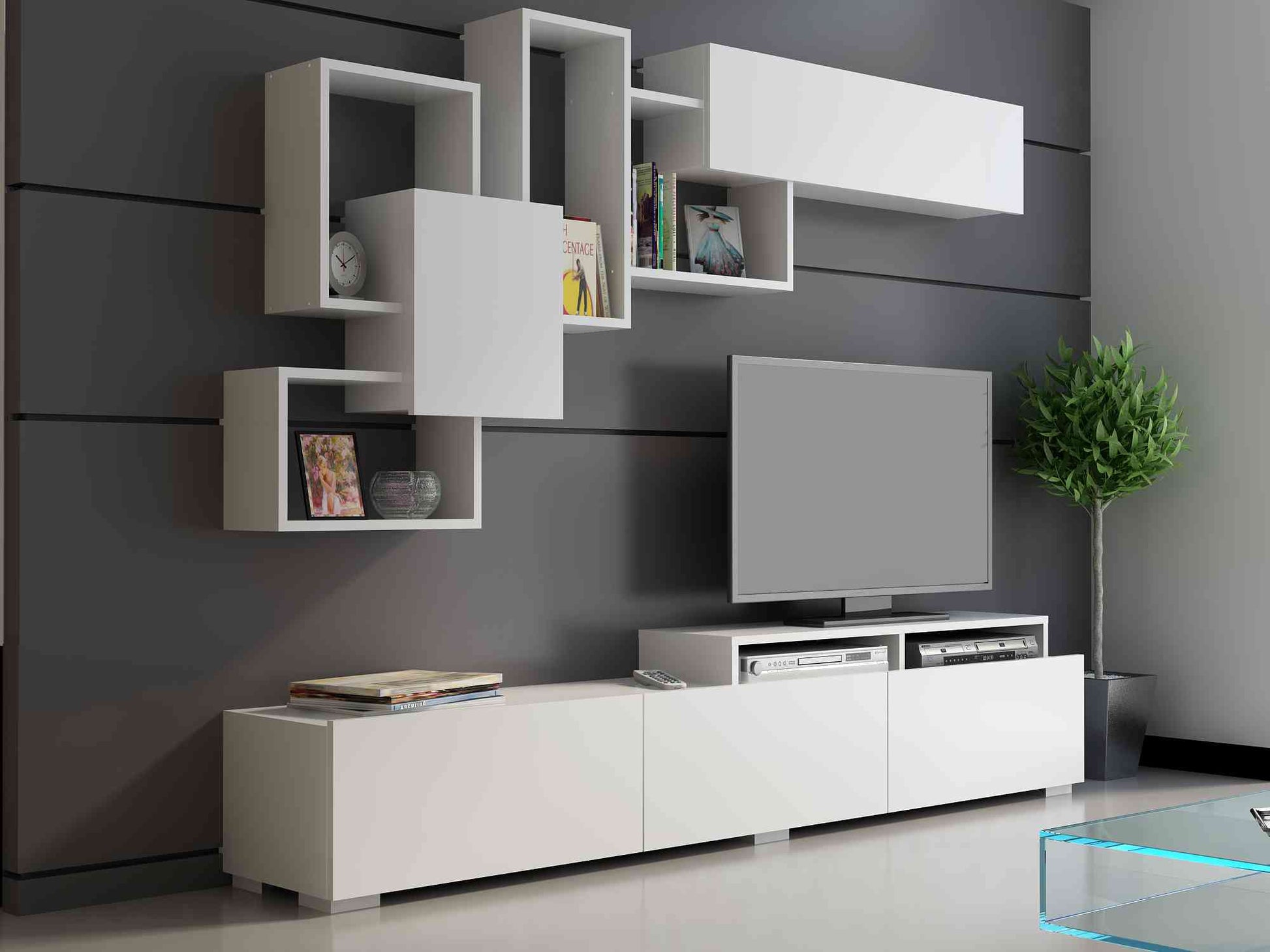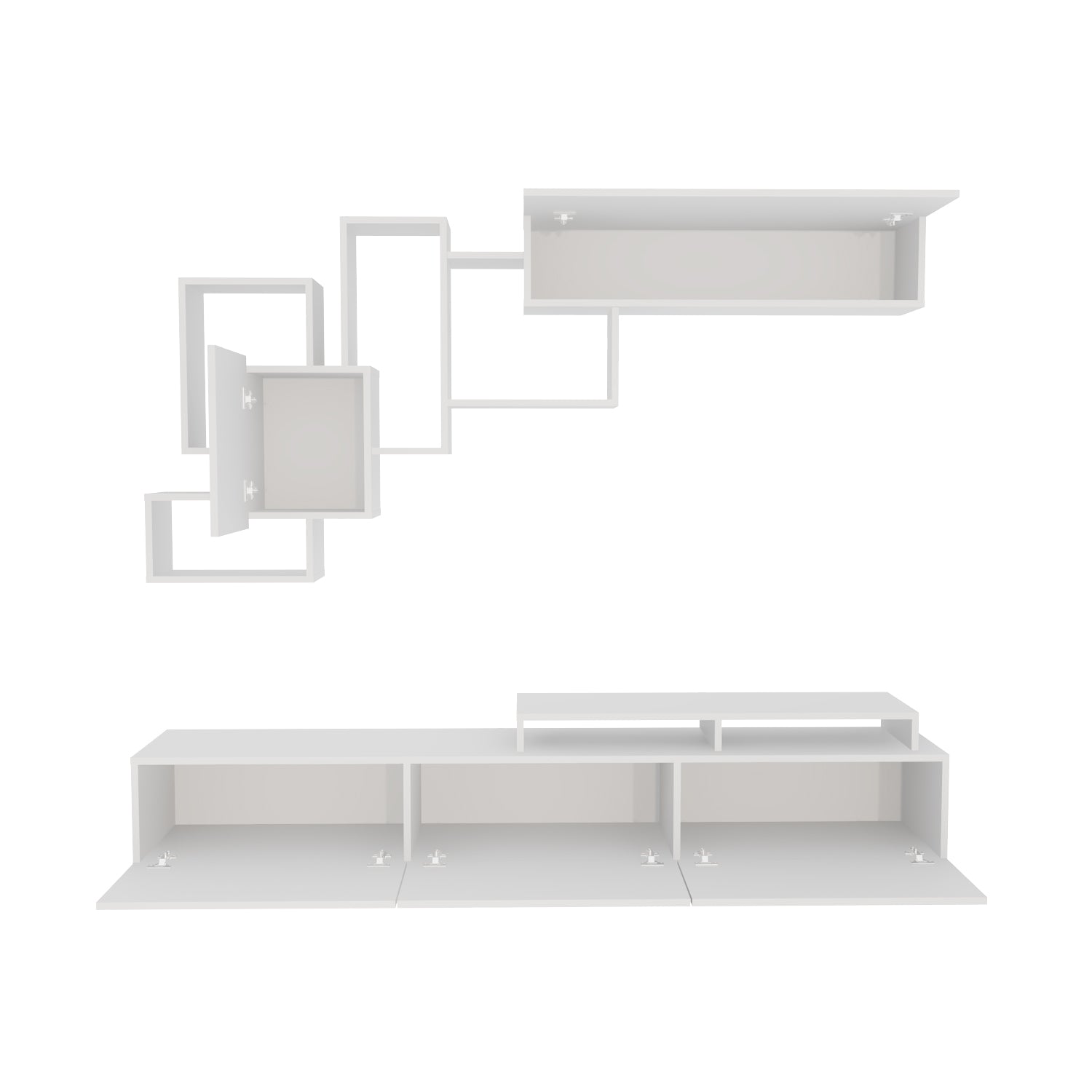 Introduce modern style and functionality into your home with the Foundations High Collection TV Stand with Wall Shelves and Cubbies. This elegant set combines a sturdy TV base (accommodating screens up to 65") and two wall-mounted shelves with cubbies, creating versatile storage space. Crafted from durable engineered wood in white (COL), the unit seamlessly fits into modern, minimalist, or Scandinavian interiors. The lower section includes 3 drop-down cabinets, perfect for hiding AV equipment, games, or accessories, and a removable under-TV shelf for flexible height adjustment. The wall-mounted section features two shelves with three cubbies each, designed to display decor, books, or baskets. With dimensions of 82" (length) x 13.7" (depth), the design saves space while remaining spacious. Easy assembly and practical solutions, such as hidden cable management, make it ideal for living rooms, bedrooms, or entryways.