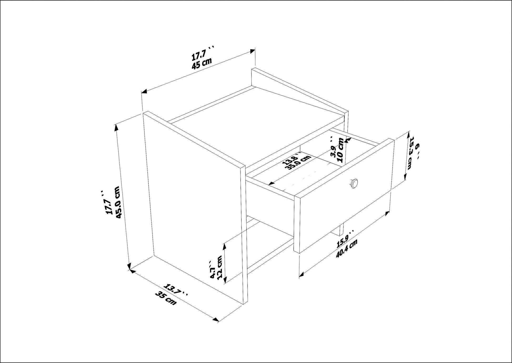 - Drawer: 3.9” H x 13.8” W x 13” D