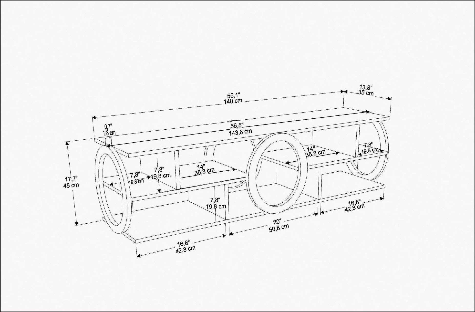 Overall – 17.7” H x 55” W x 13.8” D
