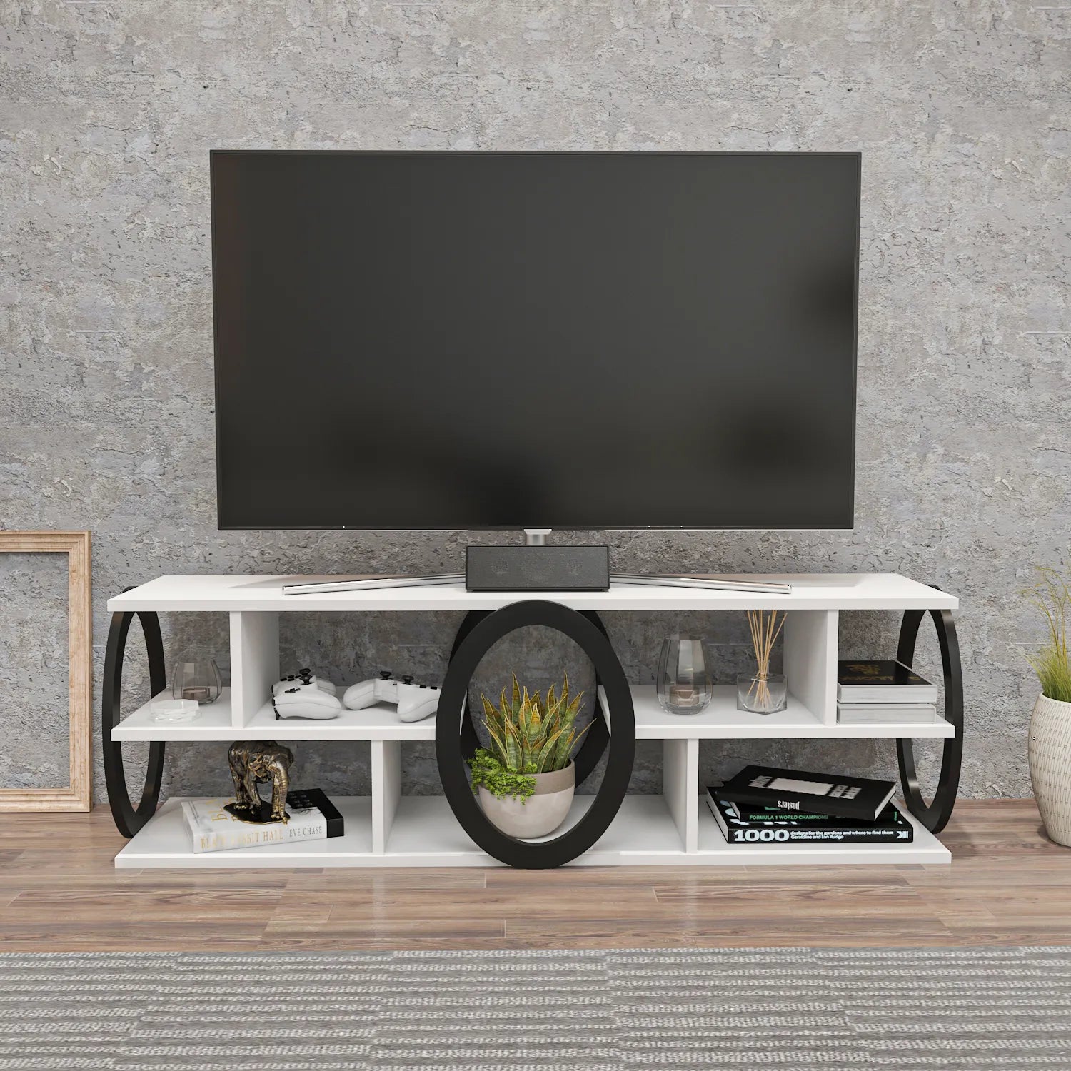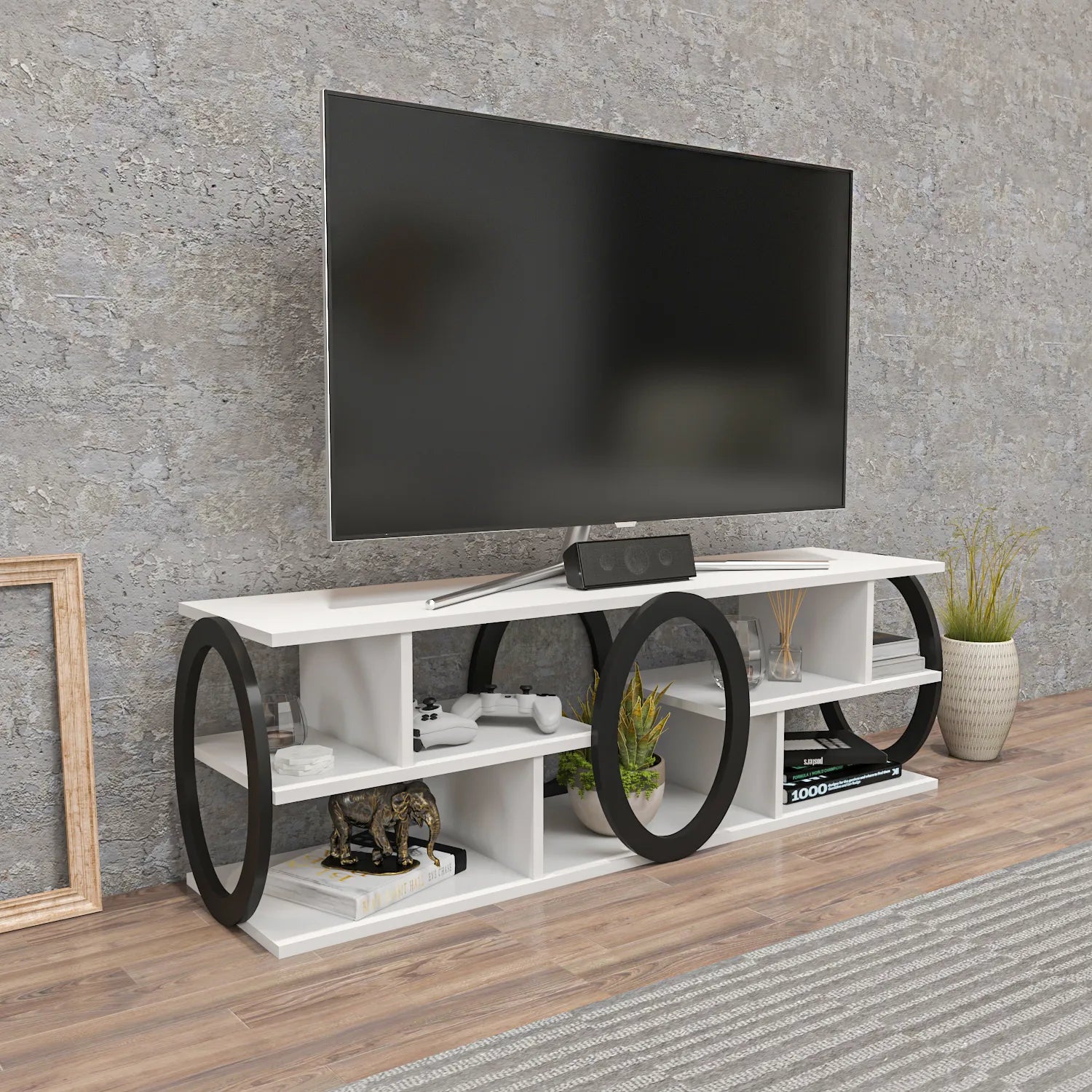 Fale 55” wide TV stand and media console is designed for larger living rooms and can accommodate TVs up to 60”. The media stand provides a lot of space for storage with its open shelves. It is made of 18 mm thick standard quality melamine coated particle board and banded with PVC edge banding tape. It is manufactured using eco-friendly and health-friendly TSE certified materials. The product will be delivered to the customer in the original package as disassembled. It is designed to be assembled by the customer easily using a drill and screwdriver. Assembly instruction and installation hardware are included in the package. For fast and error-free installation, product parts are numbered with stickers in accordance with the assembly guide.