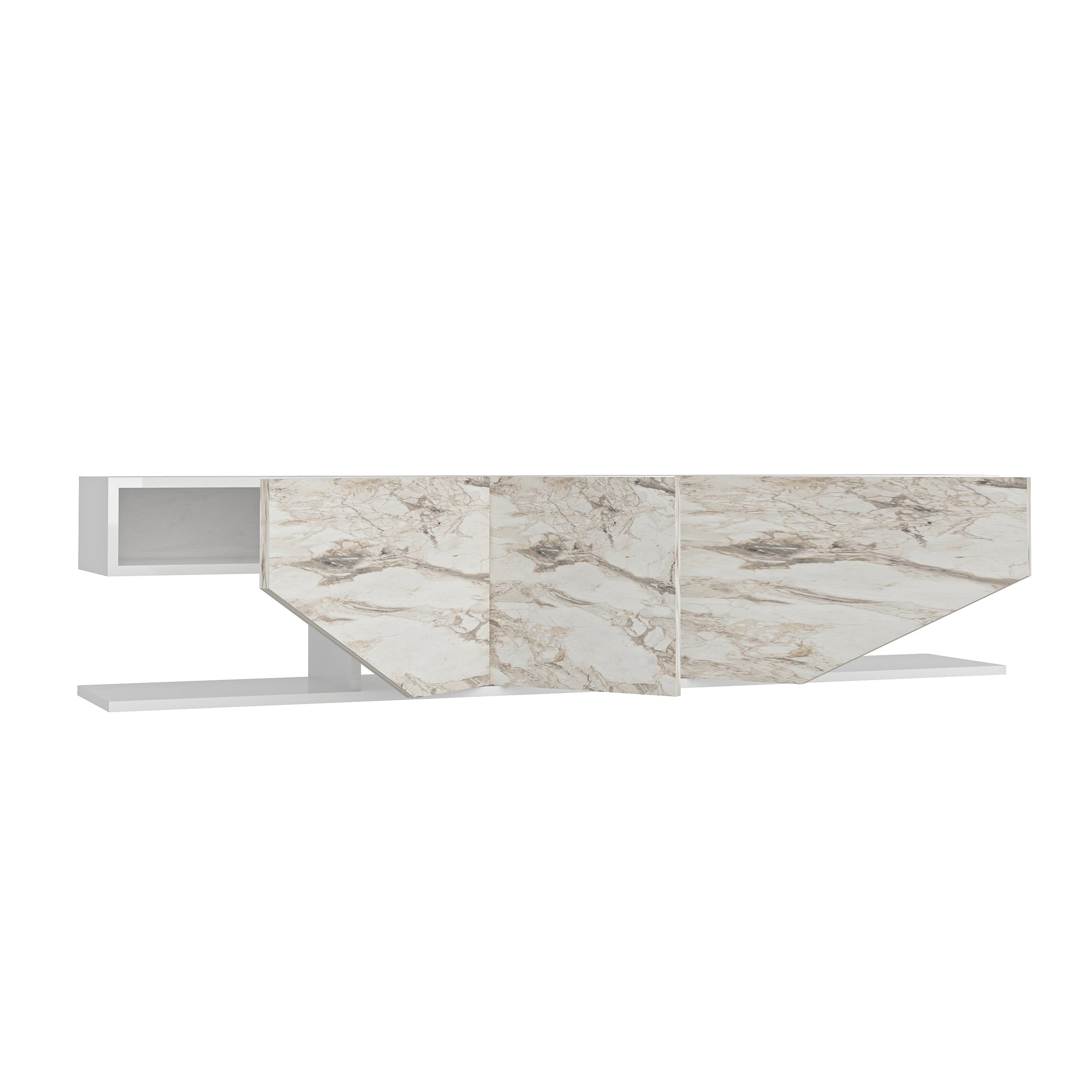 The asymmetrical, floating-inspired structure adds a sculptural presence to your room, making it as much a design statement as a media solution. Open shelving provides easy access to media devices, books, or decorative accents, while the spacious top surface comfortably supports large flat-screen TVs.
