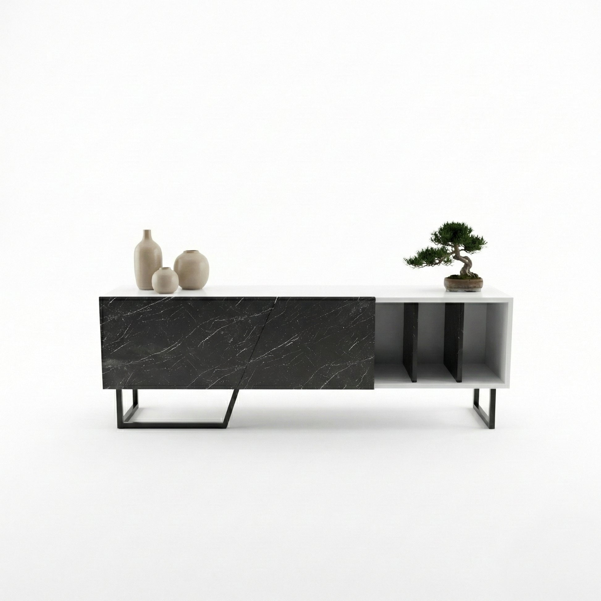 Designed to be the focal point of your living room, the Linossa Media Console features a striking asymmetrical design that blends a pristine white frame with sophisticated black marble-patterned cabinet doors. Sitting atop sturdy, industrial-style iron legs, this unit offers a floating aesthetic that makes your room feel larger and more open.
