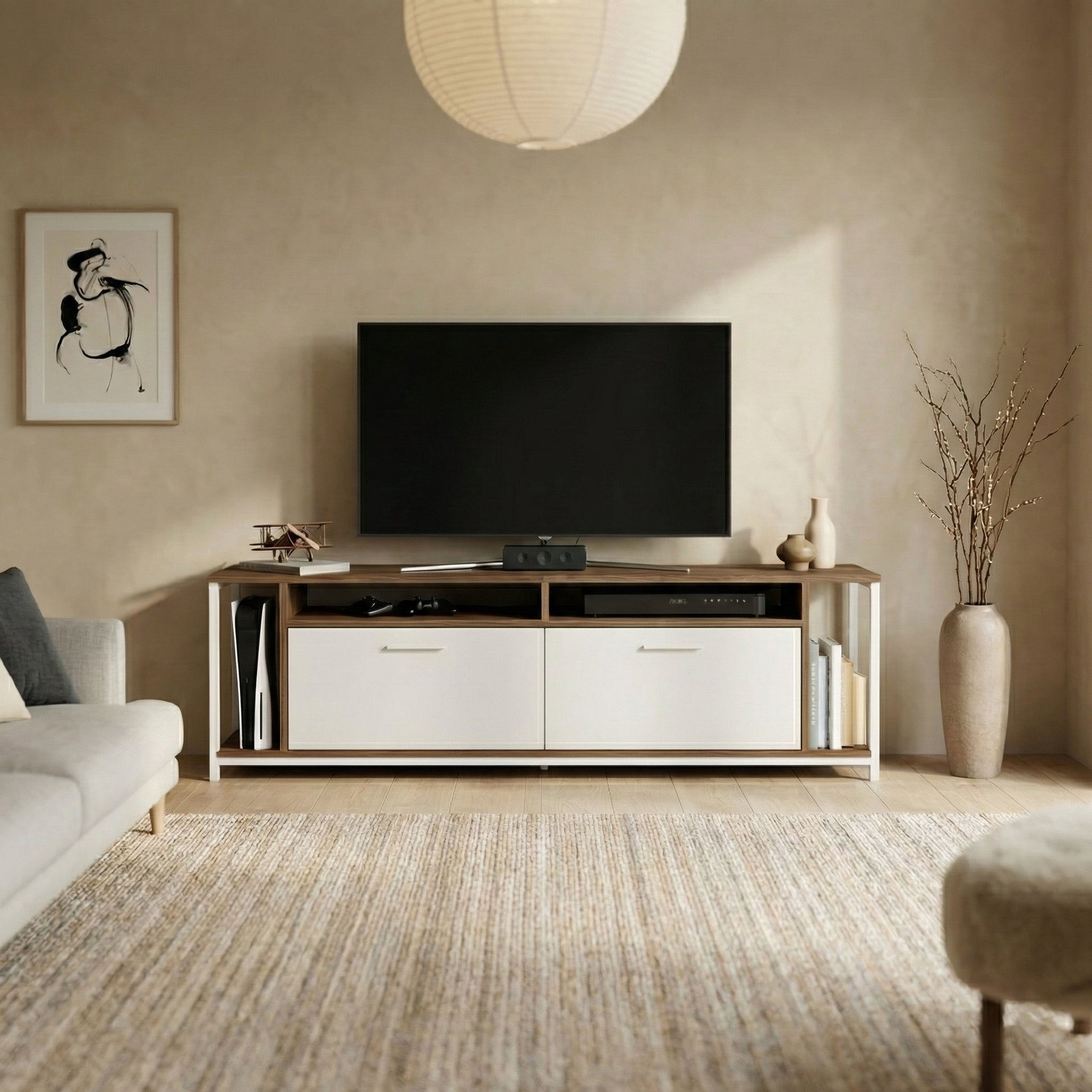 The Omar 63” wide TV stand and media console is perfect for larger living rooms, accommodating TVs up to 72”. This media stand offers ample storage with its open shelves, cabinets, and cubbies. Built with a metal frame and legs, it features 18 mm thick melamine-coated particle board, banded with PVC edge banding tape. Made with eco-friendly and health-friendly TSE certified materials, the Omar TV stand is delivered disassembled in its original package. It’s designed for easy assembly with a drill and screwdriver, complete with detailed instructions and numbered parts for fast and error-free installation.