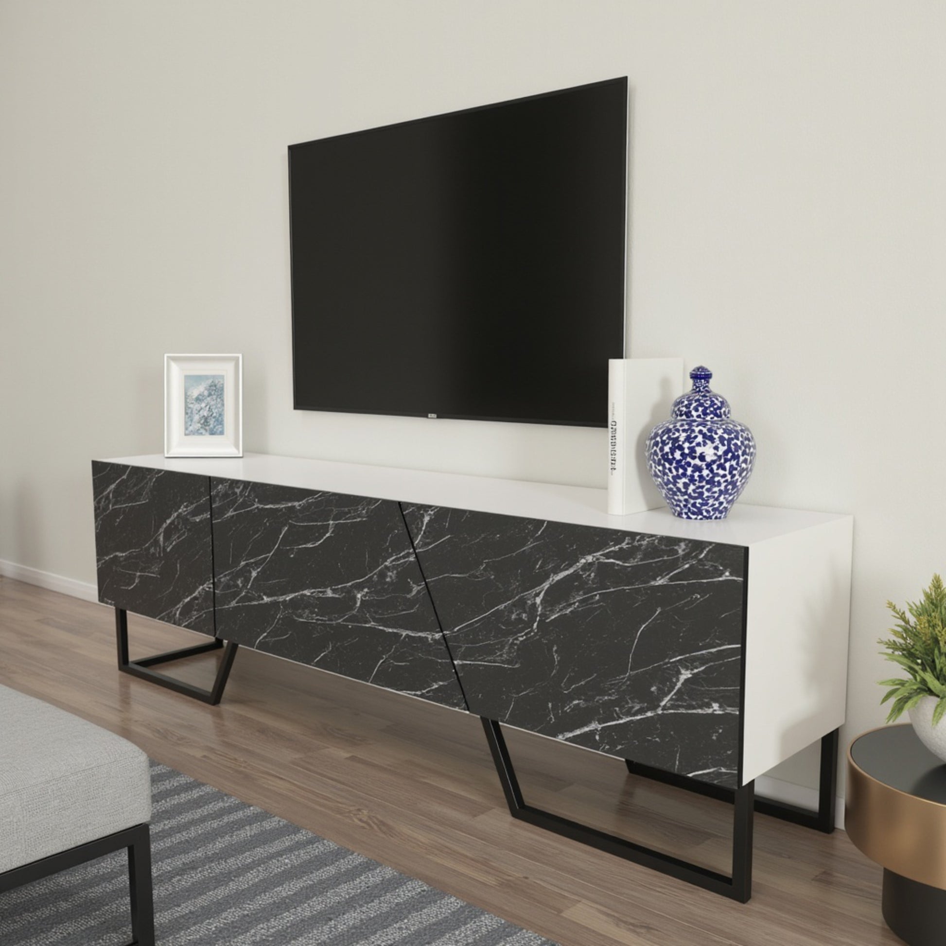 The Parla Media Console is defined by its striking asymmetrical silhouette. Featuring a pristine white frame contrasted against sophisticated black marble-patterned doors, this unit serves as both a functional entertainment center and a piece of modern art. The unique diagonal cut of the cabinet doors is mirrored by the architectural metal legs, creating a cohesive, high-end look.