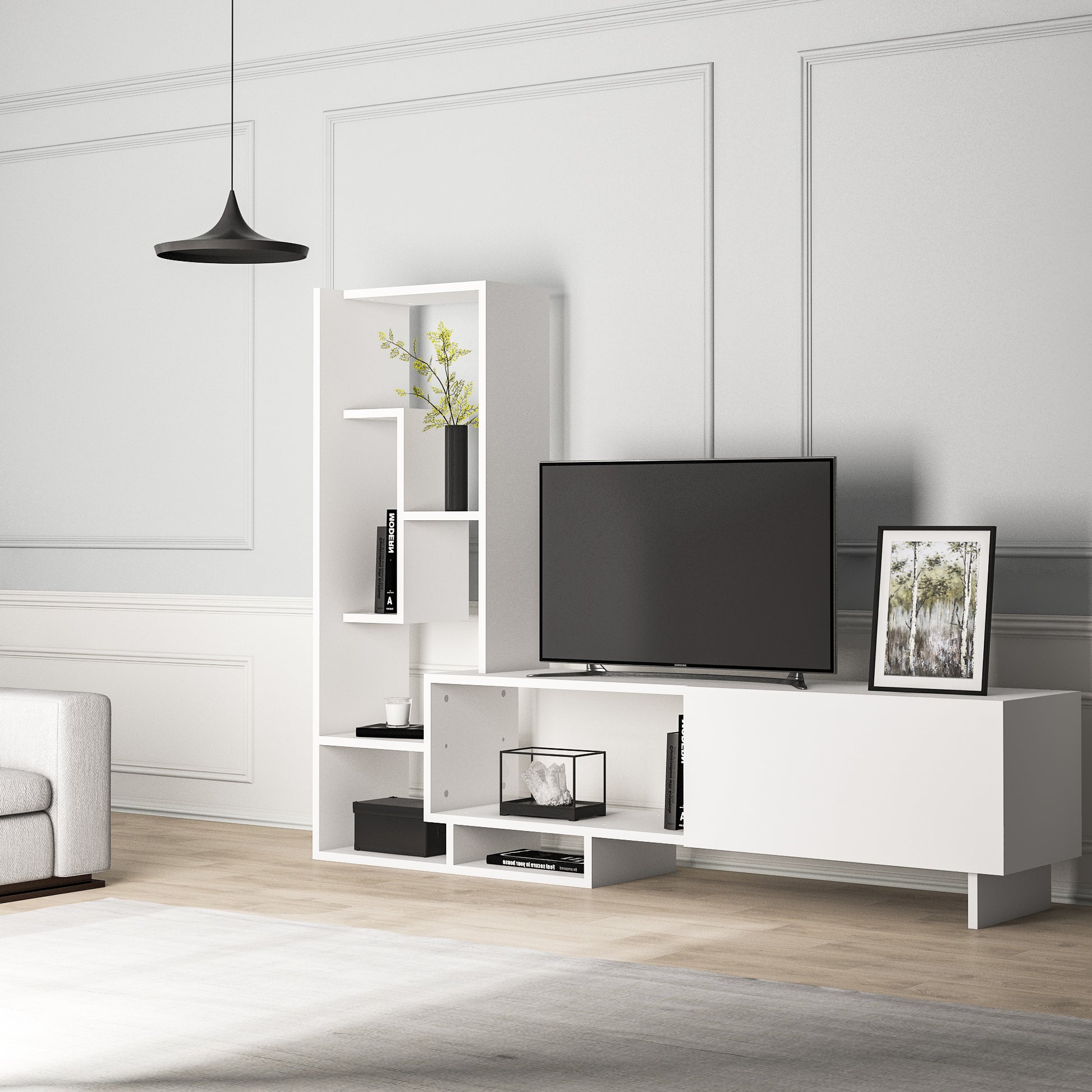 Crafted from 18mm thick melamine coated manufactured wood and banded with PVC edge banding tape. The Pegai TV stand and entertainment center features a cabinet and a side tower with 6 asymmetric open shelves that offer up some contemporary appeal, as well as provide a place to showcase or store books, favorite items, photographs, and more. The TV stand is a modern way of decorating your living room. After assembly, it measures 47'' H x 63'' W x 11.6'' D and can support flat TVs up to 55". It will be delivered to the customer in the original package as disassembled. The product is designed to be assembled by the customer using a power drill and screwdriver. Assembly instruction and installation hardware are included in the package. For fast and error-free installation, product parts are numbered with stickers in accordance with the assembly guide.