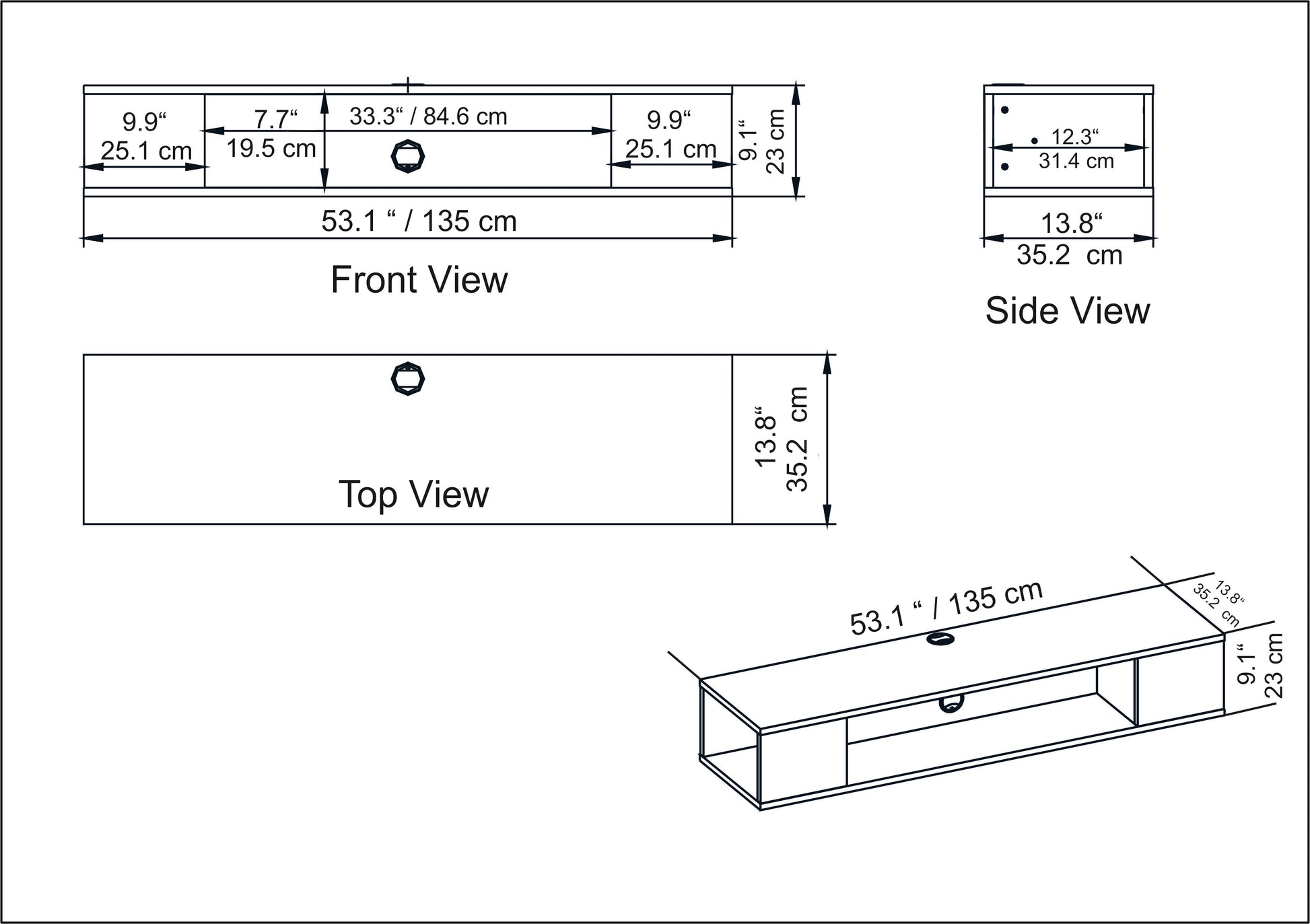 Simple yet contemporary floating TV stand and media console will open up free space and bring in airy look to your living room. It is not designed to hold a TV, instead this design requires that the TV must be wall-mounted as shown in the photo. The Peti 53 inches wide media stand features four cubbies providing storage space for your books, electronic devices and media equipment. You can also showcase your decorative items and favorite family photos on the top space of the stand. Triple-holed adjustable cable management system with a small wire compartment in the back is specially designed to meet contemporary growing technological needs. The media stand will suit perfectly for any wall-mountable TVs up to 61''. Available in pure white, oud oak and black melamine coated finishes. It is made of 18mm thick A quality melamine coated particle board and banded with first class PVC edge banding tape. The product will be delivered to the customer in original package as disassembled. It is designed to be assembled and mounted to wall by the customer easily using power drill. Assembly instruction and installation hardware including metal wall mounting apparatus are included in the package. For fast and error-free installation, product parts are numbered with stickers in accordance with the assembly guide.